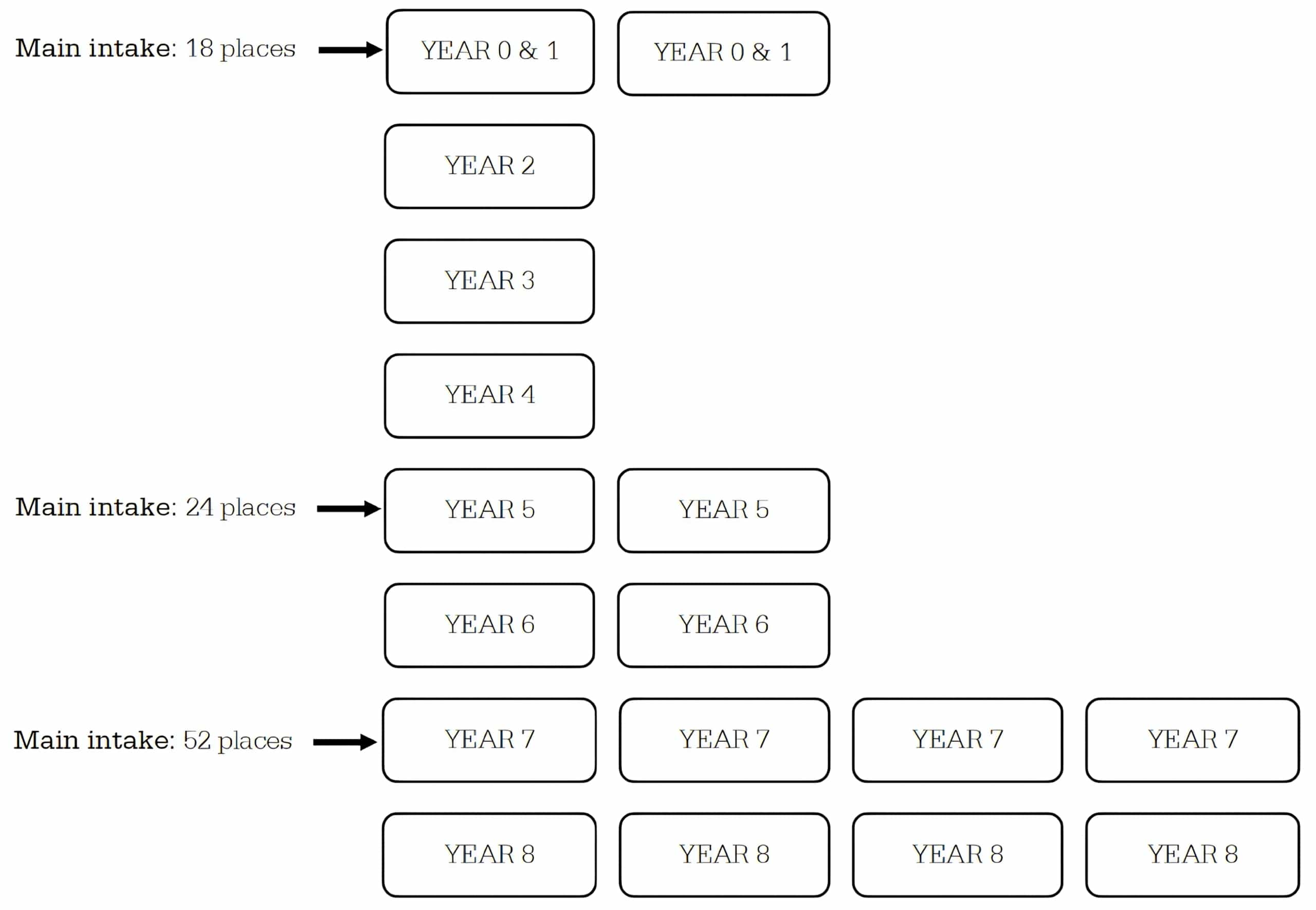 Our primary intake points are now at the New Entrant (Year 0 or 1), Year 5, and Year 7 levels, where we add additional classes to increase capacity.